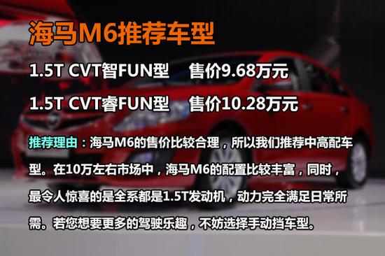 总结:海马M6的到来,不但带来经济实惠的好选择,更借助小排量涡轮增压发动机与实用的配置带来不错的竞争力。海马M6这次有7款车型可供选择,其中CVT车型在平顺节油方面更值得我们选择。在三款CVT车型中,1.5T CVT智FUN型和 1.5T CVT睿FUN型在价格以及配置方面的综合性价比表现更值得我们推荐。