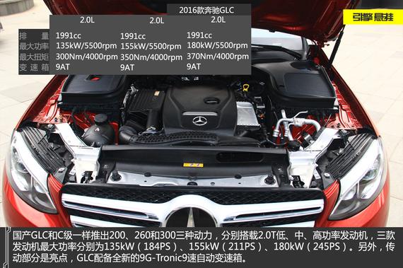 动力方面,国产GLC和C级一样推出200、260和300三种动力,分别搭载2.0T低、中、高功率发动机,三款发动机最大功率分别为135kW(184PS)、155kW(211PS)、180kW(245PS)。另外,传动部分是亮点,GLC配备全新的9G-Tronic9速自动变速箱。